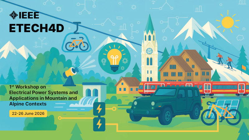 We are delighted to invite you to the first IEEE Workshop on Electrical Power Systems and Applications in Mountain and Alpine Contexts, a unique event that combines technical education, scientific discussion, and practical insights into the electrification of alpine regions. The workshop will take place from Monday June 22th to Thursday June 25th, offering an engaging program that caters to researchers, students, and professionals alike. ETECH4D IEEE Workshop aims to explore innovative solutions and research advancements in the field of electrical engineering applied to alpine environments.